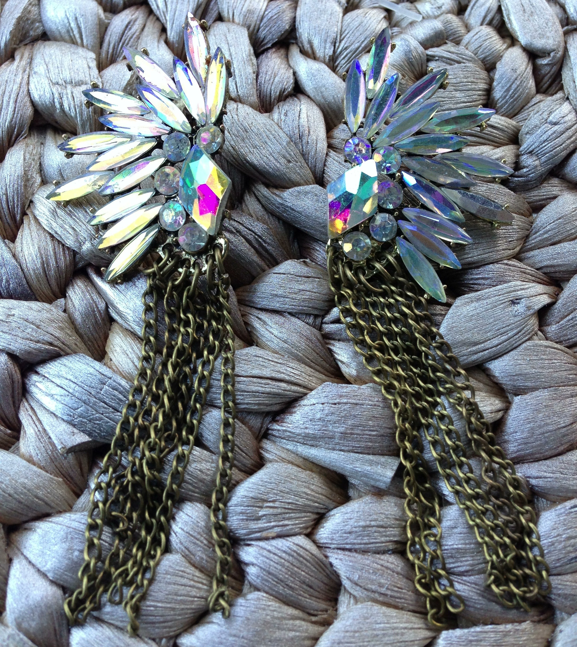 Such a statement piece you can dress them up or make these the focus of your outfit. An iridescent white with dangling gold chains.
