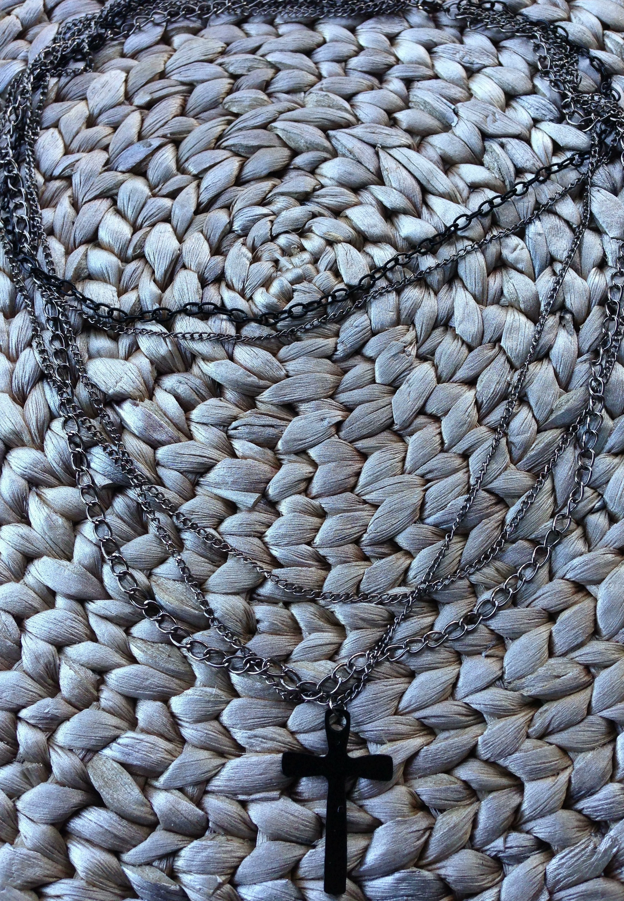 The Chained Crucifix is a multi chained necklace with black and grey chains and a black cross perfect to add that edgy look to your outfit.