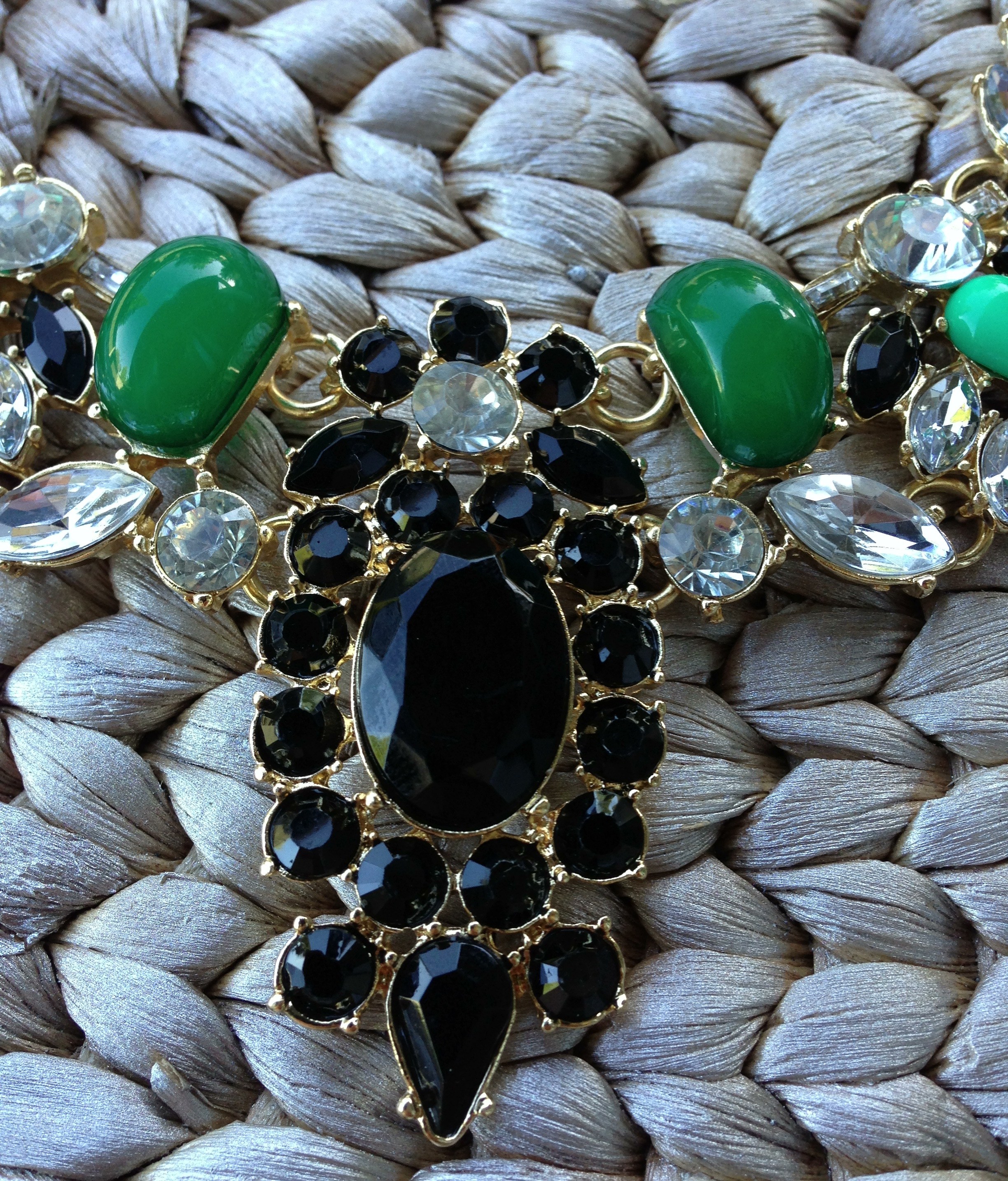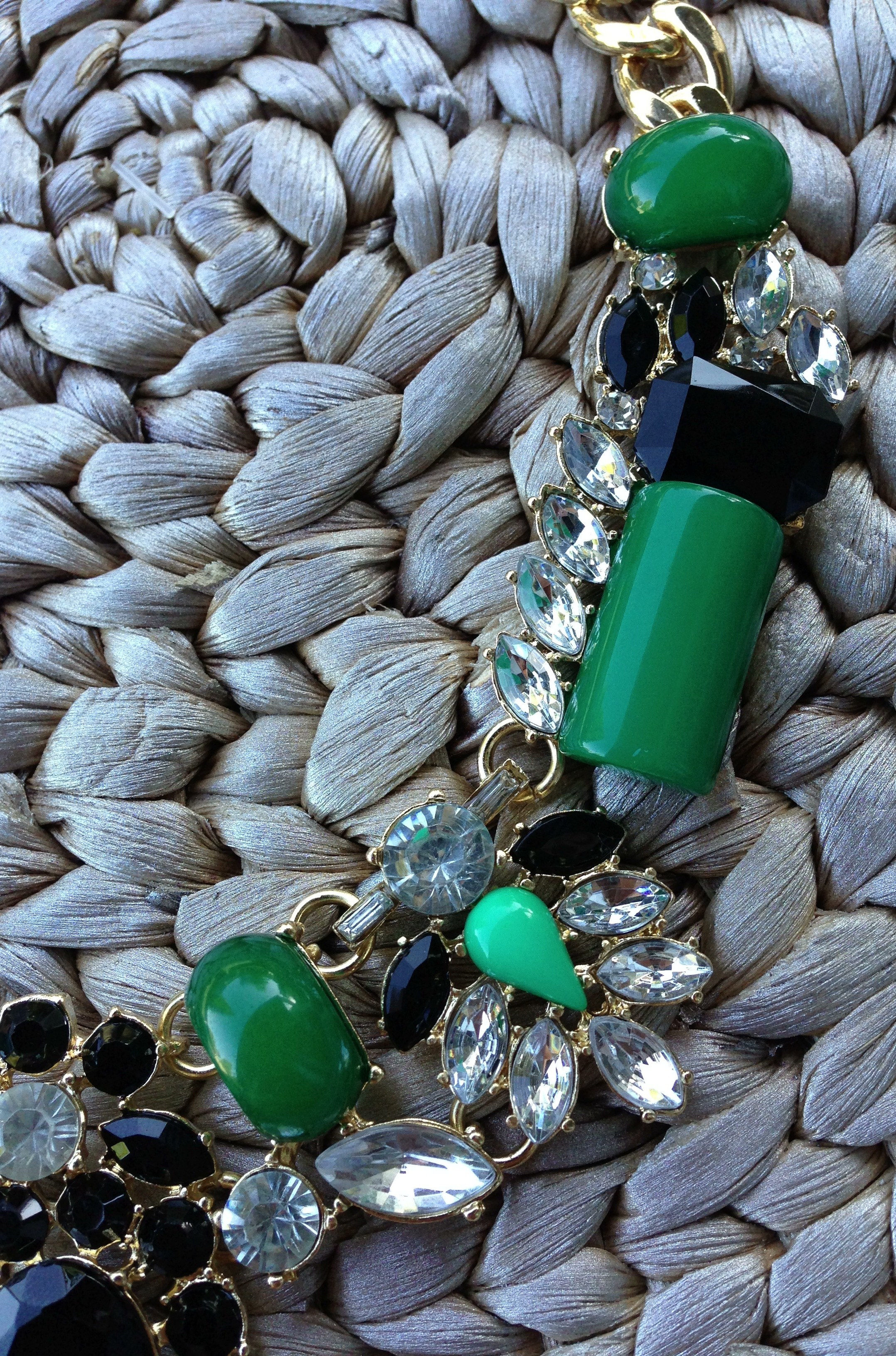 The Audrey necklace is an elegant bold statement piece with its emerald green and black stones and clear crystals its the perfect accessory for any occasion wether its a casual day with jeans heels and a t-shirt or a night out!